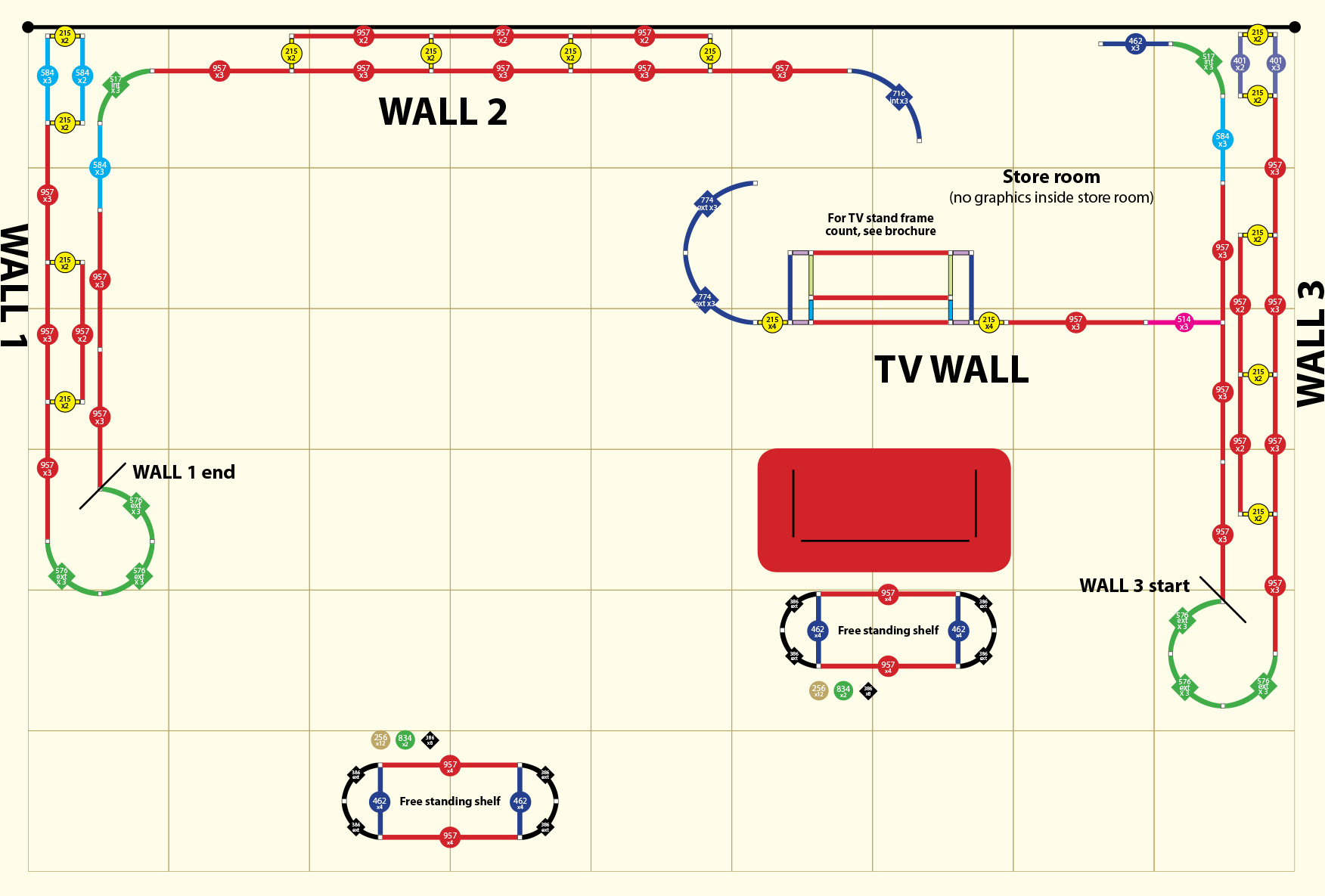 This example of a 9 x 6mtr exhibition floor-plan shows an overhead view of the space with an outline of the stand as well as graphic examples of the sections of walls that create the overall exhibition stand.